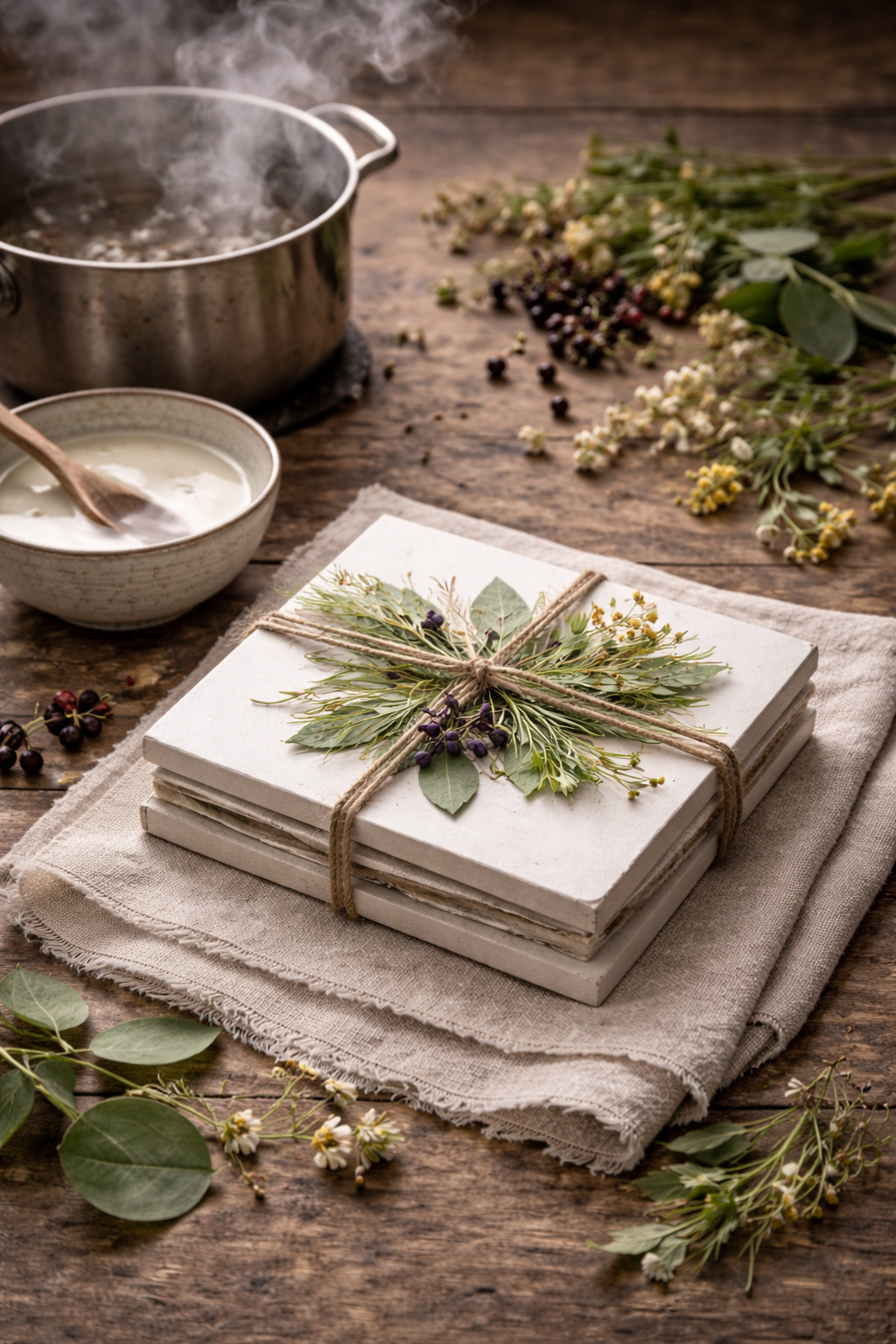 In my process, I instead prepare fabrics using a soy milk bath. Soy milk acts as a natural binder for plant-based dyes, forming a light protein layer on cellulose fibers such as cotton, linen, and hemp. This coating helps the natural pigments attach to the fabric while offering a more environmentally considerate alternative to conventional mordants.
