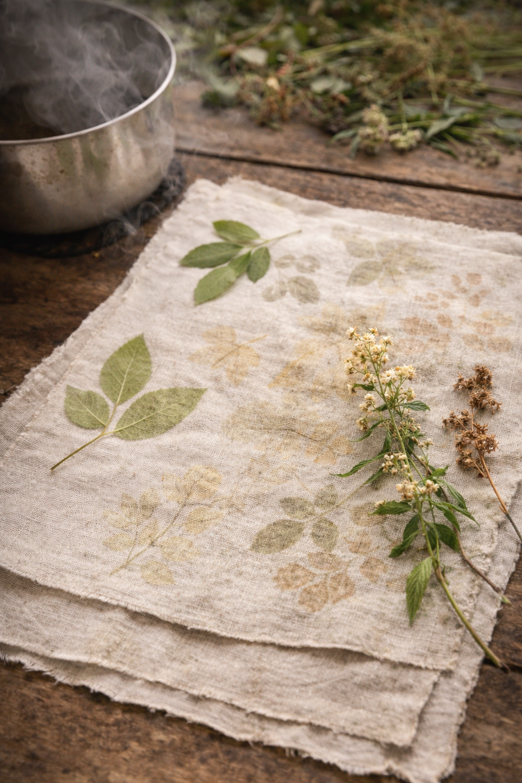 I take care to use methods that are gentle and mindful of their impact on the environment. In traditional natural dyeing and eco-printing, mordants such as alum or iron are often used to help dyes bond permanently with fabric. While effective, these substances can carry environmental concerns when used or disposed of improperly.