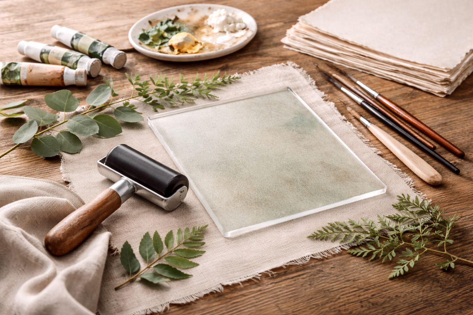 Monoprinting traditionally uses a printing plate, brayer, pigment, brushes, and paper.